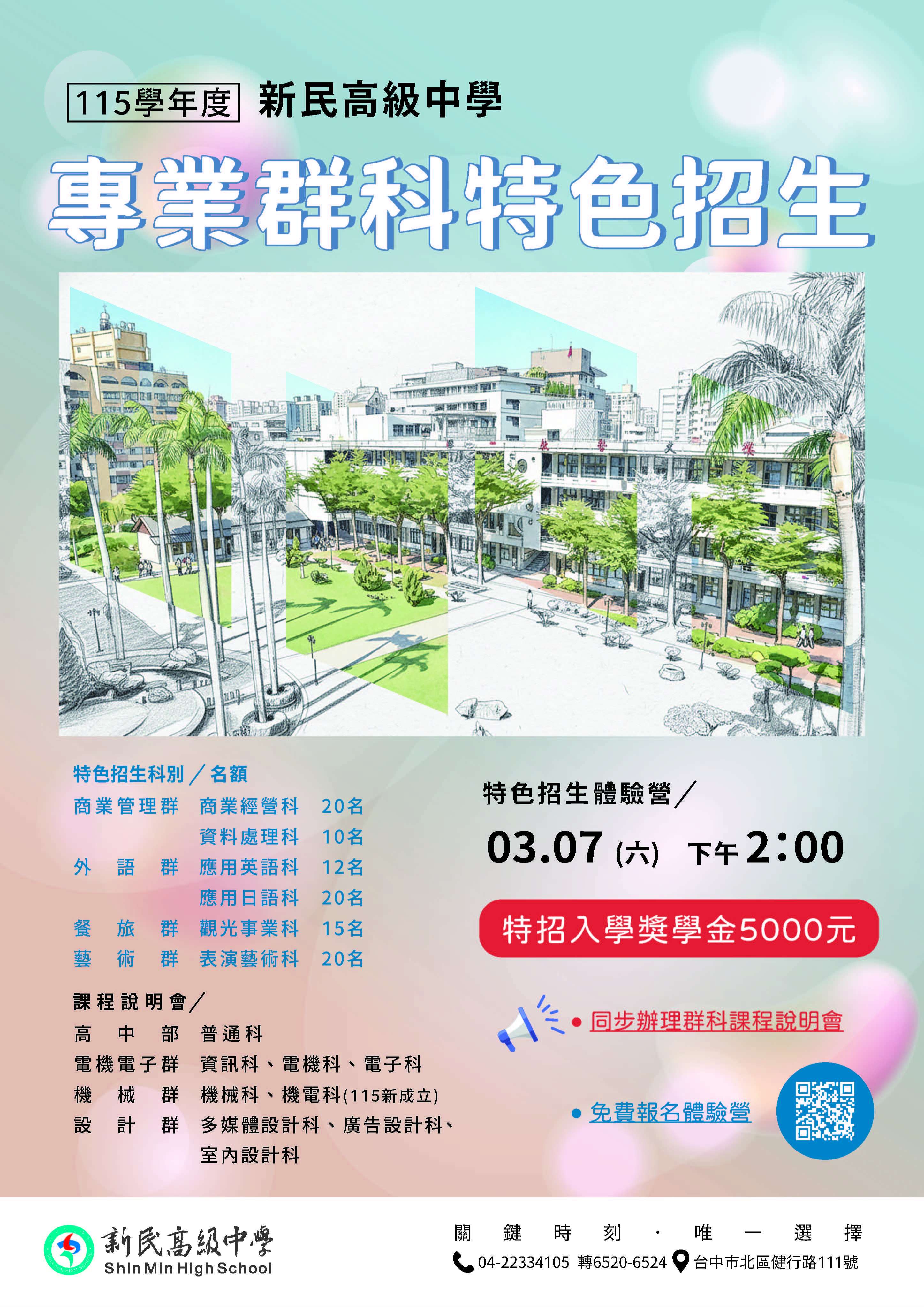 二、115學年度本校特色招生科別:商業經營科20名、資料處理科10名、觀光事業科15名、應用英文科12名、應用日語科20名、表演藝術科20名。